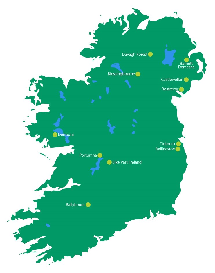 There are currently eleven official mountain bike trail centres in Ireland. There are three National Trail Centres (Rostrevor, Castlewellan & Davagh Forest) and two Regional Trail Centres (Barnett Demesne & Blessingbourne) in Northern Ireland and six designated mountain bike trail centres in the Republic of Ireland.